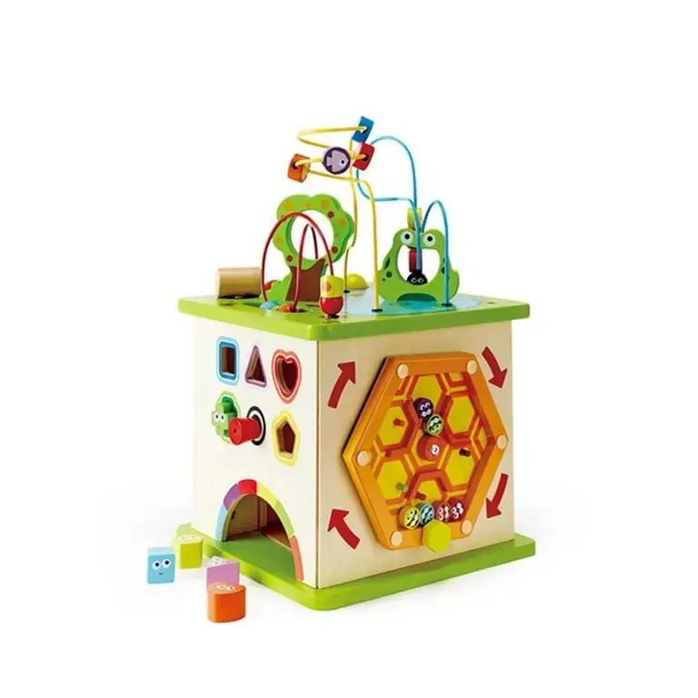 Introducing the perfect playtime companion for kids 12 months and up - the Hape Country Critters Play Cube! This unique activity cube features five sides filled with endless fun. Let your little ones explore the bead-filled adventure land, sort shapes, line up like soldiers, spin the turnplate, and tap to the bottom to complete the activity. With ten pieces including wooden balls, shapes, and a pounder featuring adorable animal designs, this learning puzzle toy enhances motor skills, logic, and perseverance. Made from sturdy wood with child-safe materials and water-based paint, it's perfect for little ones who love to play and explore. Get ready for imaginative, storytelling fun with different animal friends and a variety of activities. This vibrant, five-sided activity center will keep busy kids entertained for hours! Item Weight: 13.4 lbs, Product Dimensions (L x W x H): 13.8 x 13.8 x 19.6 inches.