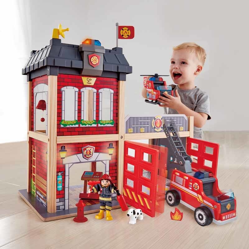 This tri-level wooden fire station ready for any emergency, with furnished office, eating and sleeping quarters, a working garage door, and a fire pole that goes from top to bottom.