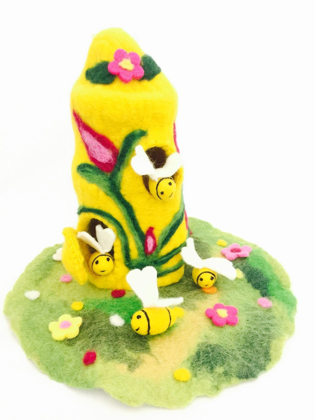 In the whimsical fairy fields of Sunflower Meadow, discover the enchanted abode of Bee Beamsprite. This mystical dwelling comes with four buzzy tenants who create a special, moonlit honey. The door opens and there are windows for the bees to come and go. The honey is full of moonbeams, which the fairies use to heal the trees, animals, and flowers. This is a 100% handmade item, so expect some slight variations that only add to its unique charm! Felt is an amazing material that can be molded back into shape with a little twist, bend, and massage. Our Himalayan Felt Co products are all individually crafted with love and care, using ethically sourced Australian and New Zealand wool in Nepal. Size: H30 x D30 cm approx. Age: 3 years +