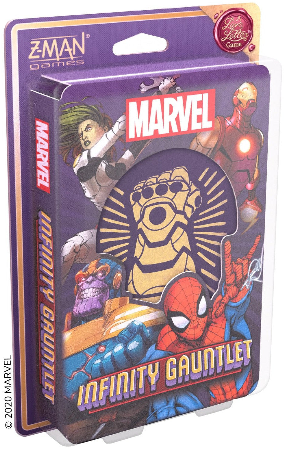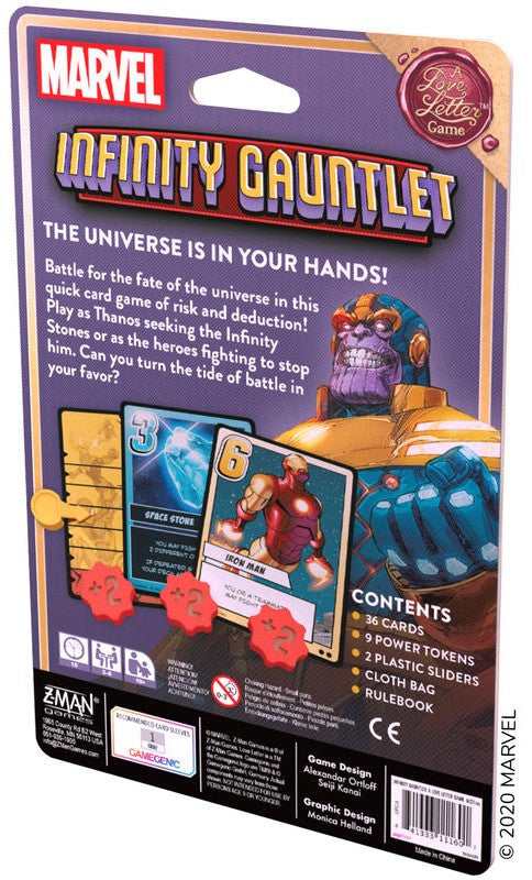The Mad Titan Thanos seeks the Infinity Stones to bend the universe to his indomitable will, but courageous heroes are assembling to stand in his path to ultimate power. Based on the beloved card game and set in the Marvel Universe, Infinity Gauntlet: A Love Letter Game features the elegant mechanics of the original, re-imagined in a one-vs-many twist for thrilling team play. While one player takes on the role of Thanos on a crusade to change the universe as we know it, 2-6 other players must deploy iconic heroes to defeat him before he can achieve his aims.