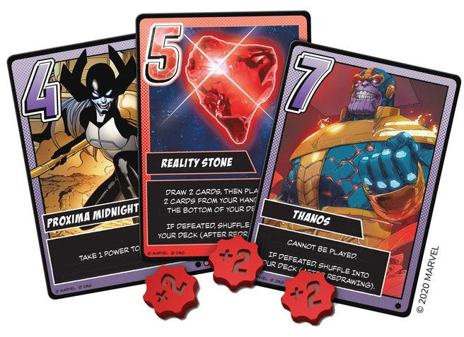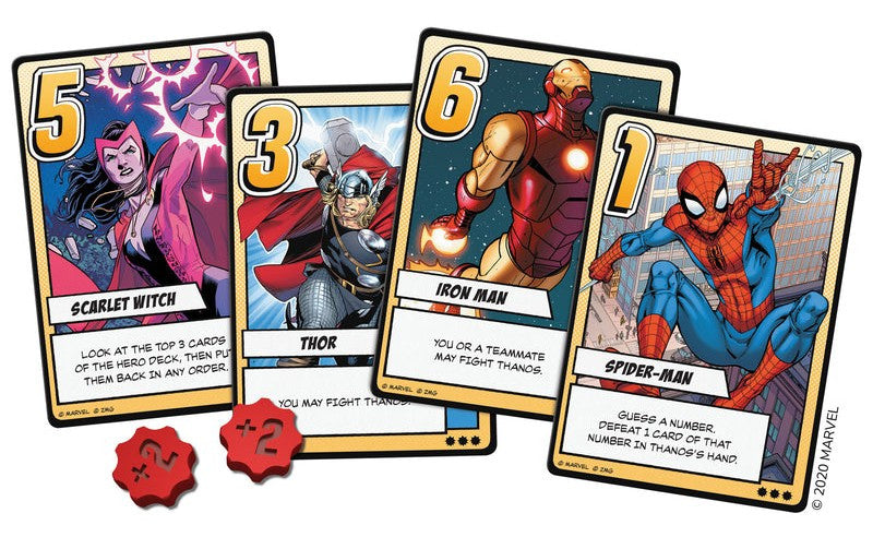 Throughout the game, players take turns drawing a card and playing a card, then executing its effect. Hero players can call upon the likes of Iron Man, Spider-man, Thor, and Scarlet Witch for their abilities to battle and gather intel about their opponent’s schemes. A worthy adversary, Thanos plays with a two-card hand, drawing from his own deck of minions and powerful Infinity Stones. The heroes will have to use their abilities in strategic combinations to knock his health down to zero before he can do the same to them—or find all six Infinity Stones and win with a snap of his fingers. Who will prevail in this battle for the universe?
