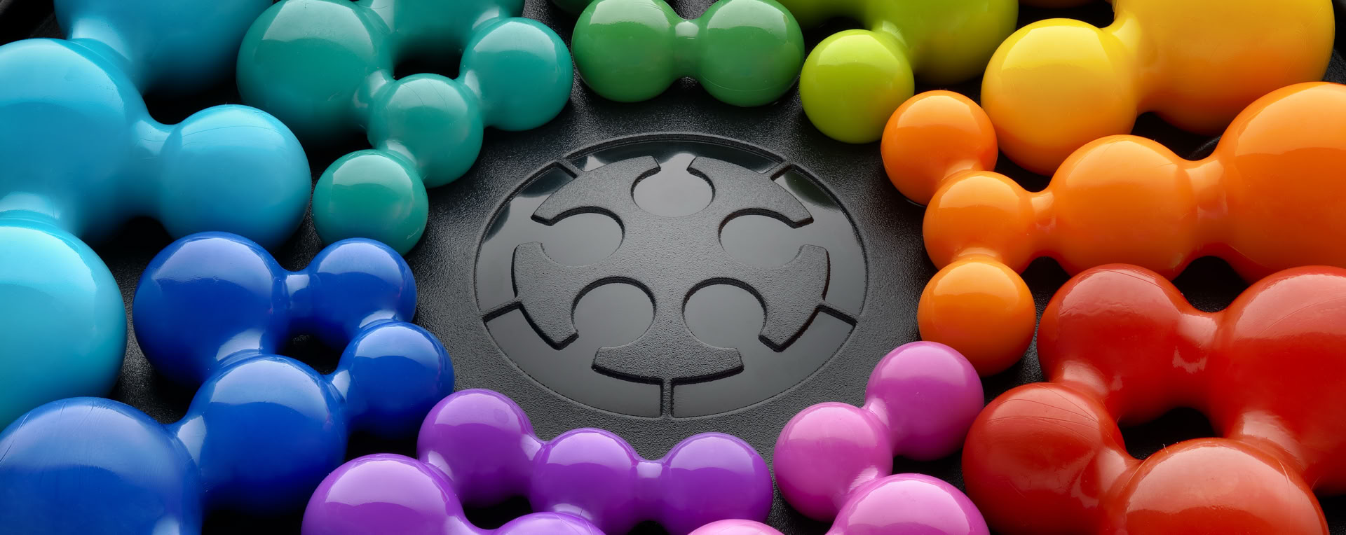 1) Choose a challenge from the booklet. Place the puzzle pieces on the game board as shown in the challenge. Puzzle pieces are made of balls of different sizes. The biggest balls only fit on the outer side of the game board. The smallest balls only fit on the central part of the game board.
