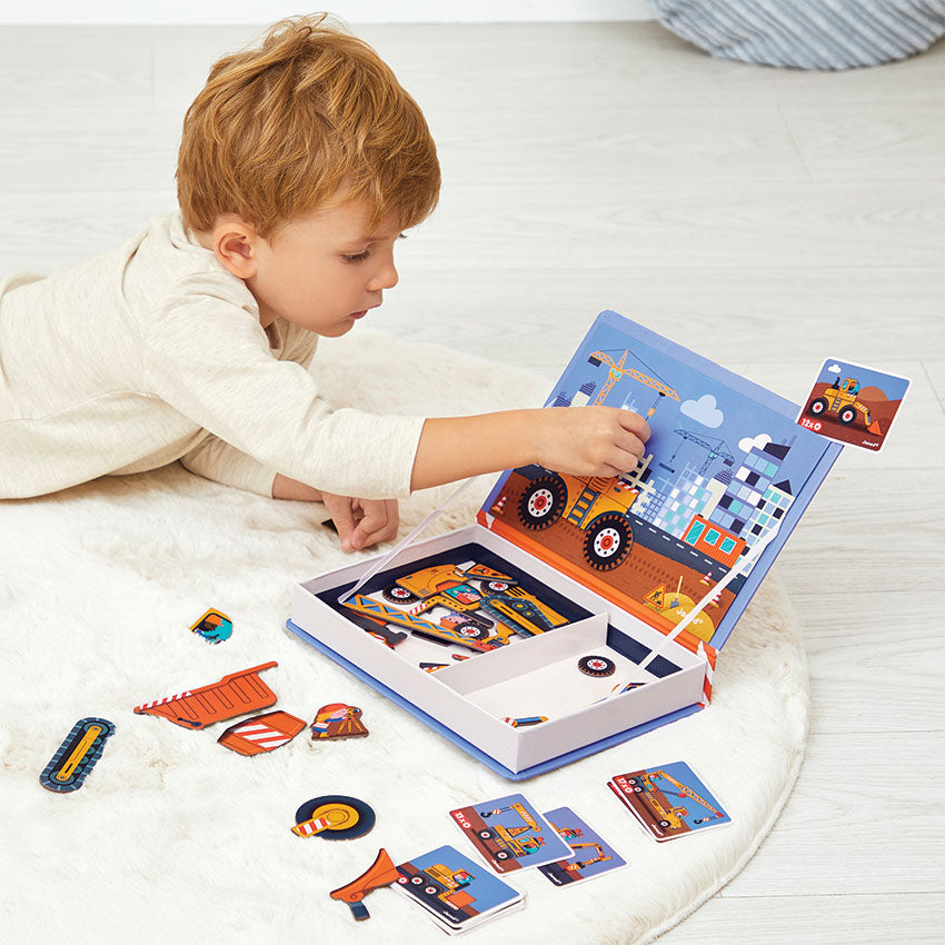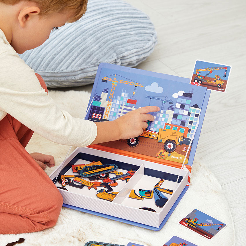 Get ready to build and create with the Janod Magnetic Book ? Construction Edition! The town is expanding, and it?s up to the construction team to make it happen. Featuring 50 vibrant magnets and 18 engaging template cards, this activity allows you to recreate classic construction vehicles such as cranes, bulldozers, jackhammers, and diggers. Or, mix and match the magnets to design your own imaginative creations!