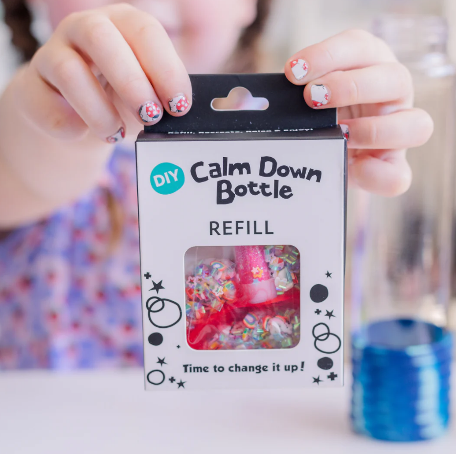 Refresh your DIY Calm Down Bottle with these quirky refill packs! Each pack has a different theme and includes glitter and crafts for your little one to create their own sensory bottle. Care Instructions: Feel free to refill the bottle whenever needed, but we suggest doing so every few months. Product Features: Fun craft packets to enhance your DIY Calm Down Bottle - just empty into the bottle and add water!