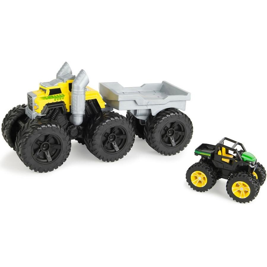 Prepare yourself for an epic adventure with the John Deere Monster Treads Roaring Rex toy set. This 3-piece set includes a massive semi-truck with removable trailer, a five inch John Deere Gator, and the ability to rev up the engine by simply pressing a button. With its massive tires and realistic exhaust sounds, this monster truck playset is perfect for tackling any terrain both indoors and outdoors. And the best part? No batteries required, so the fun never has to stop. A must-have for kids ages three and up who love the playful spirit of John Deere.