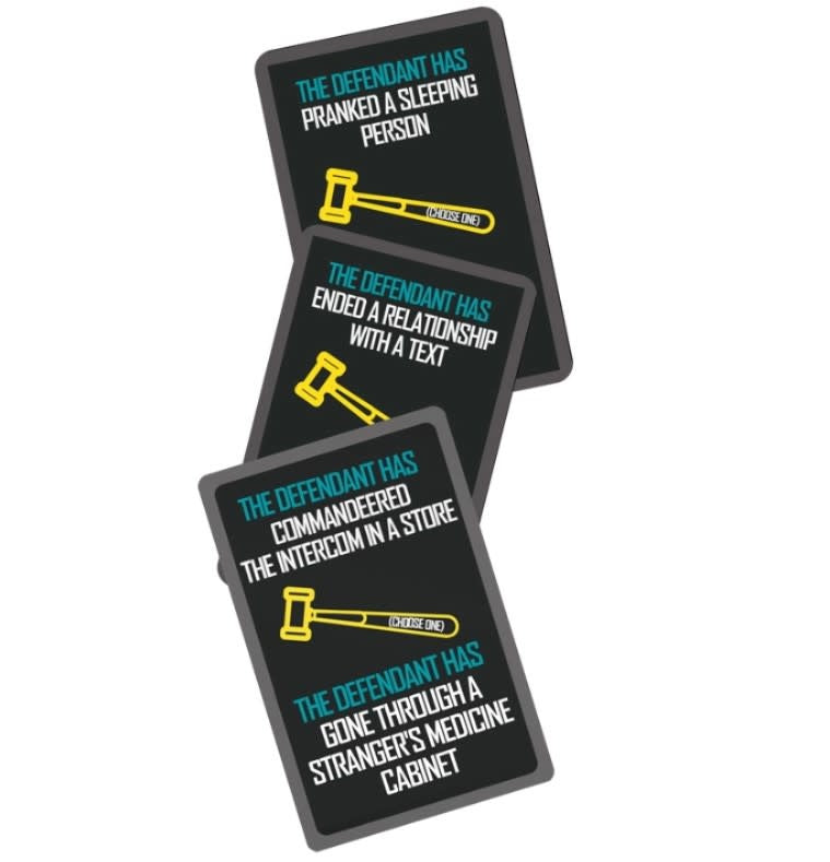 CONTENTS: Golden Gavel, Guilty & Not Guilty Coaster, 8 Guilty Cards, 8 Not Guilty Cards, 400 Scenarios, $190K in Play Money, Instructions.