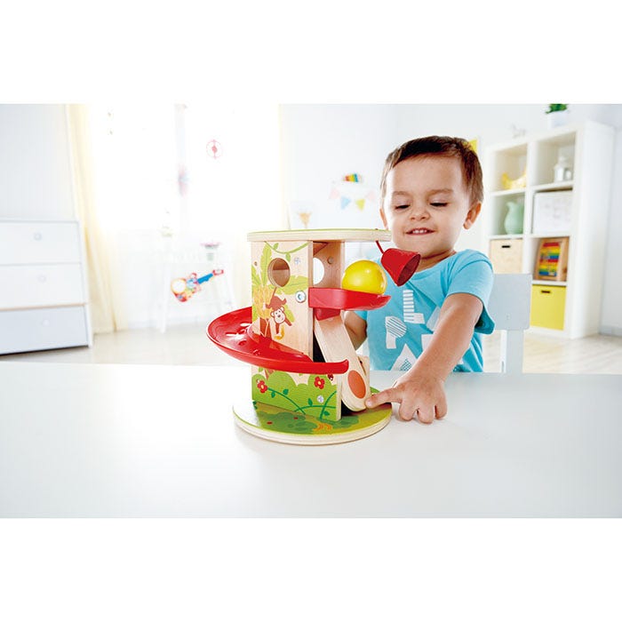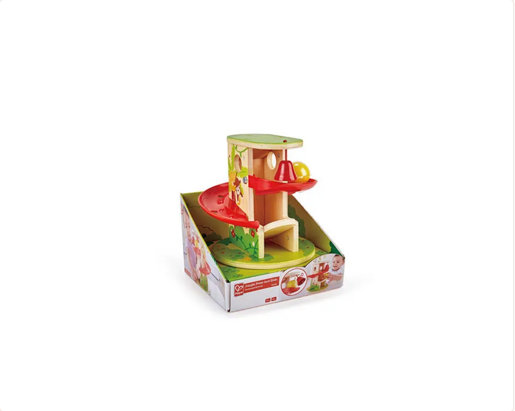 Sliding is fun! Make the wooden ball race around the tree to the jungle floor. Then press the lever to start all over again! Press the lever to launch the ball onto the slide so it rings the bell. Then press to go again and again! Ages 18mnths+