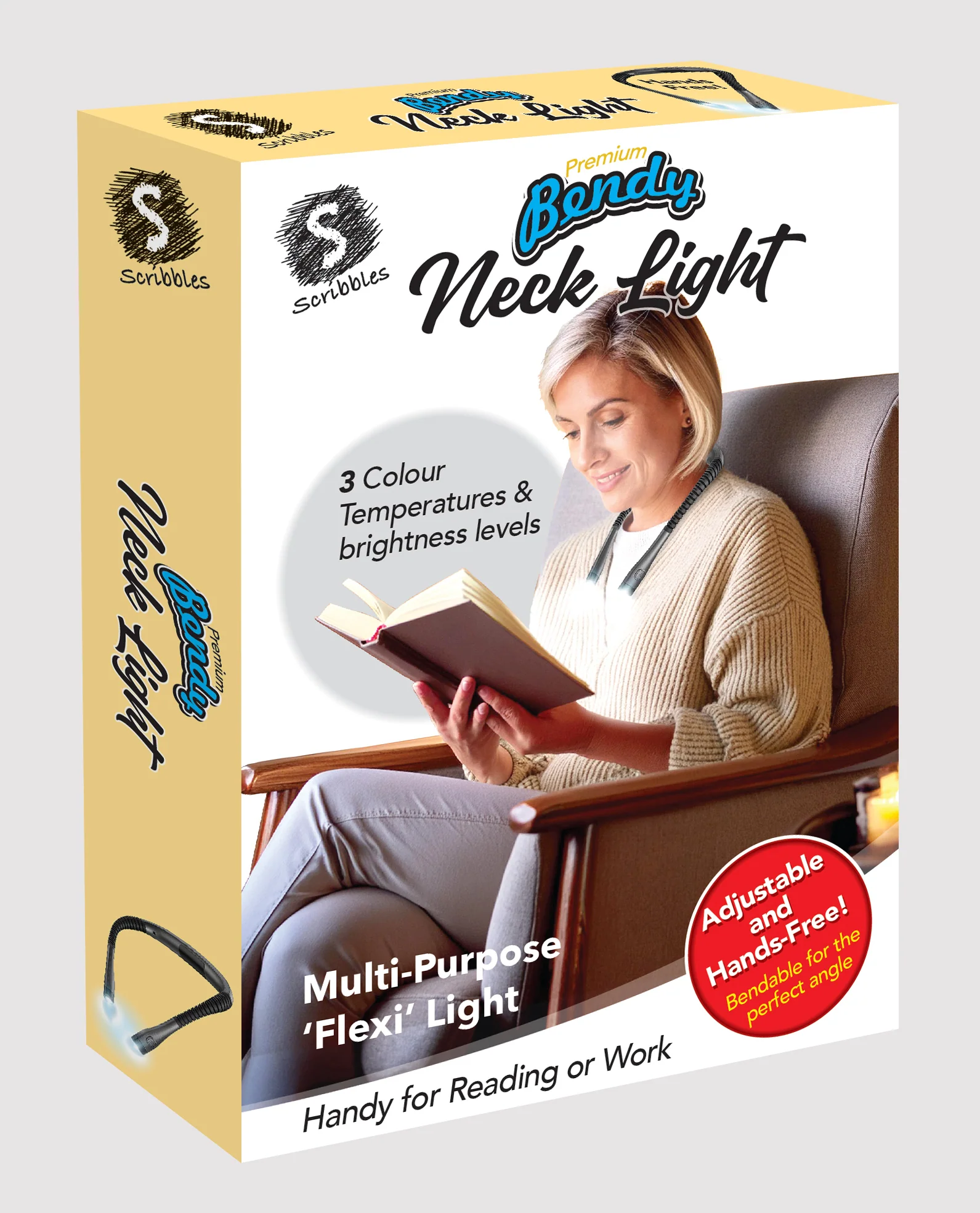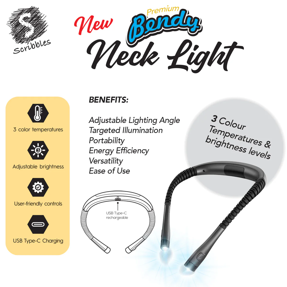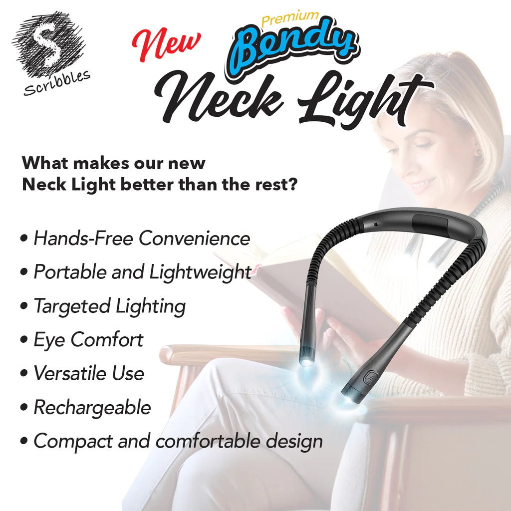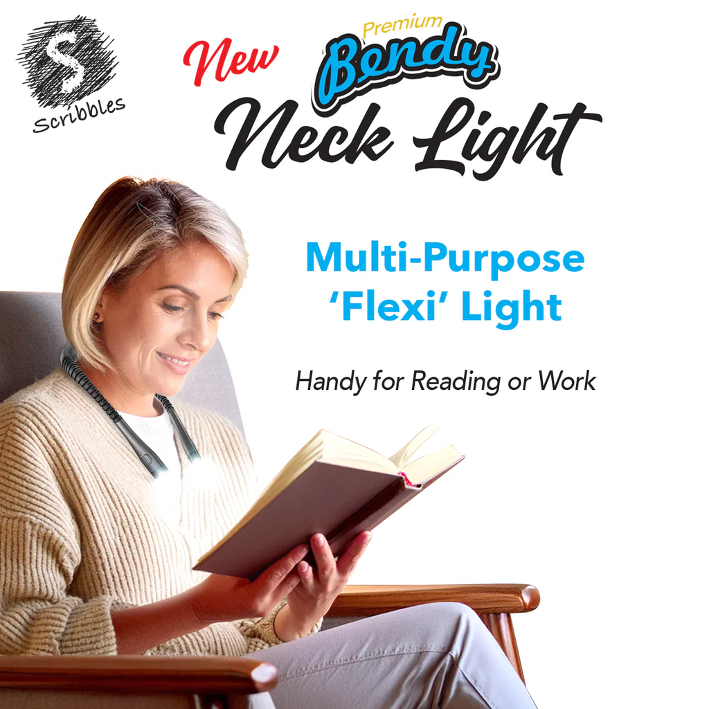 The Scribbles Premium Bendy Neck Light is a versatile, hands-free light perfect for reading, crafting, camping, and more. With 3 color modes (yellow, warm white, cool white), 6 brightness levels, and up to 80 hours of battery life, it's fully adjustable to suit your needs. USB Type-C charging, flicker-free LEDs, and ergonomic design ensure comfort and convenience. Its narrow beam design lights your space without disturbing others, making it ideal for shared environments.