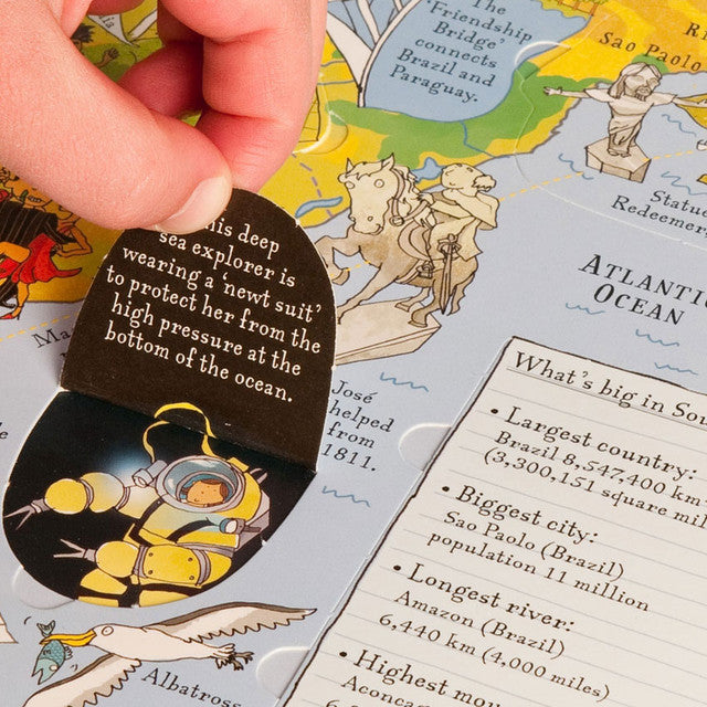 An atlas full of flaps to lift, revealing beautiful buildings, exotic animals and fabulous sights. Divided into the separate continents, each double page is crammed with information on sights and cultures to be seen all over the world as well as country borders and capital cities. Includes a giant world map poster. An excellent interactive book to help children learn about the world.