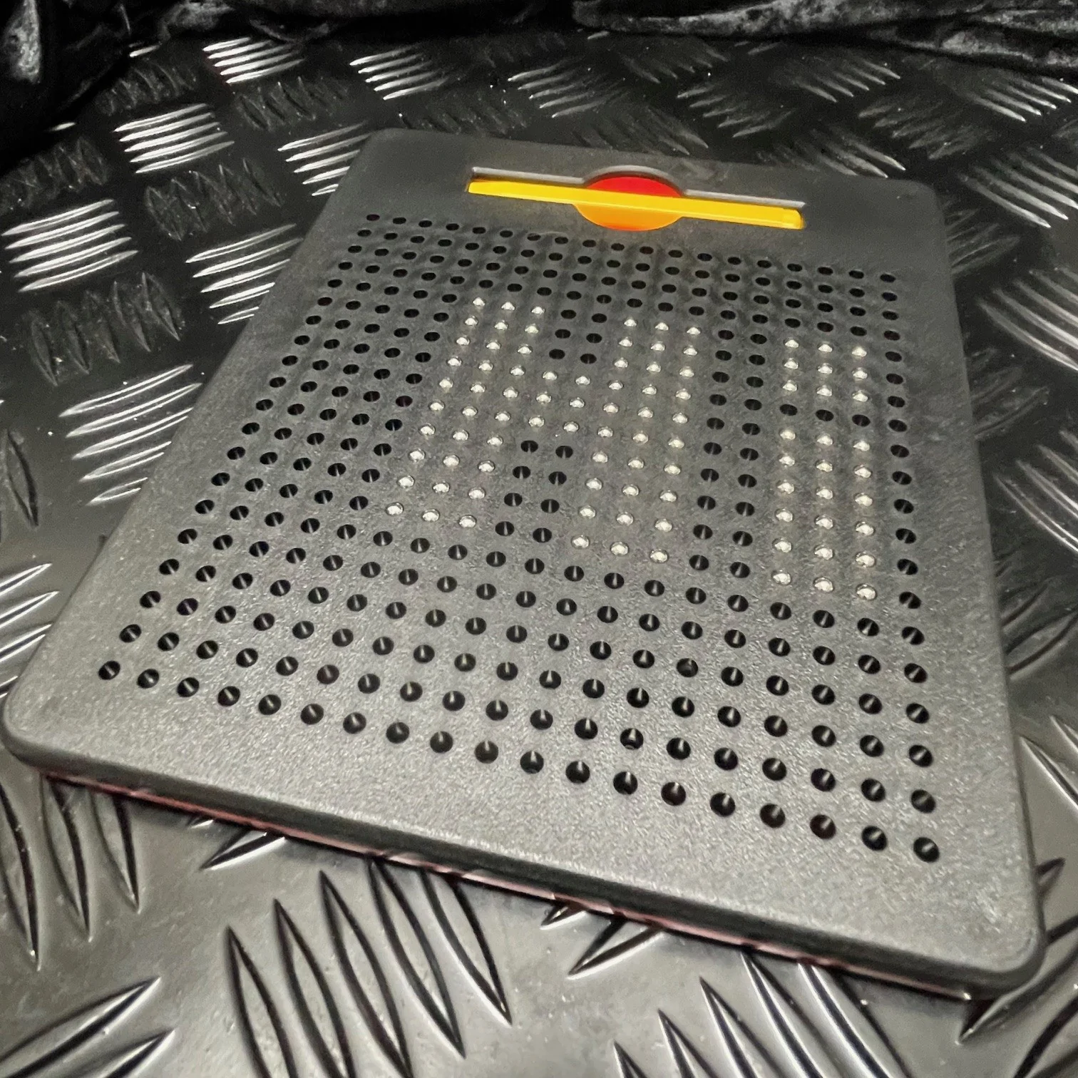 The board has 380 holes each containing a tiny (and secure) magnetic ball. When you pass the stylus across the top, the mini beads are drawn to the top creating your picture.