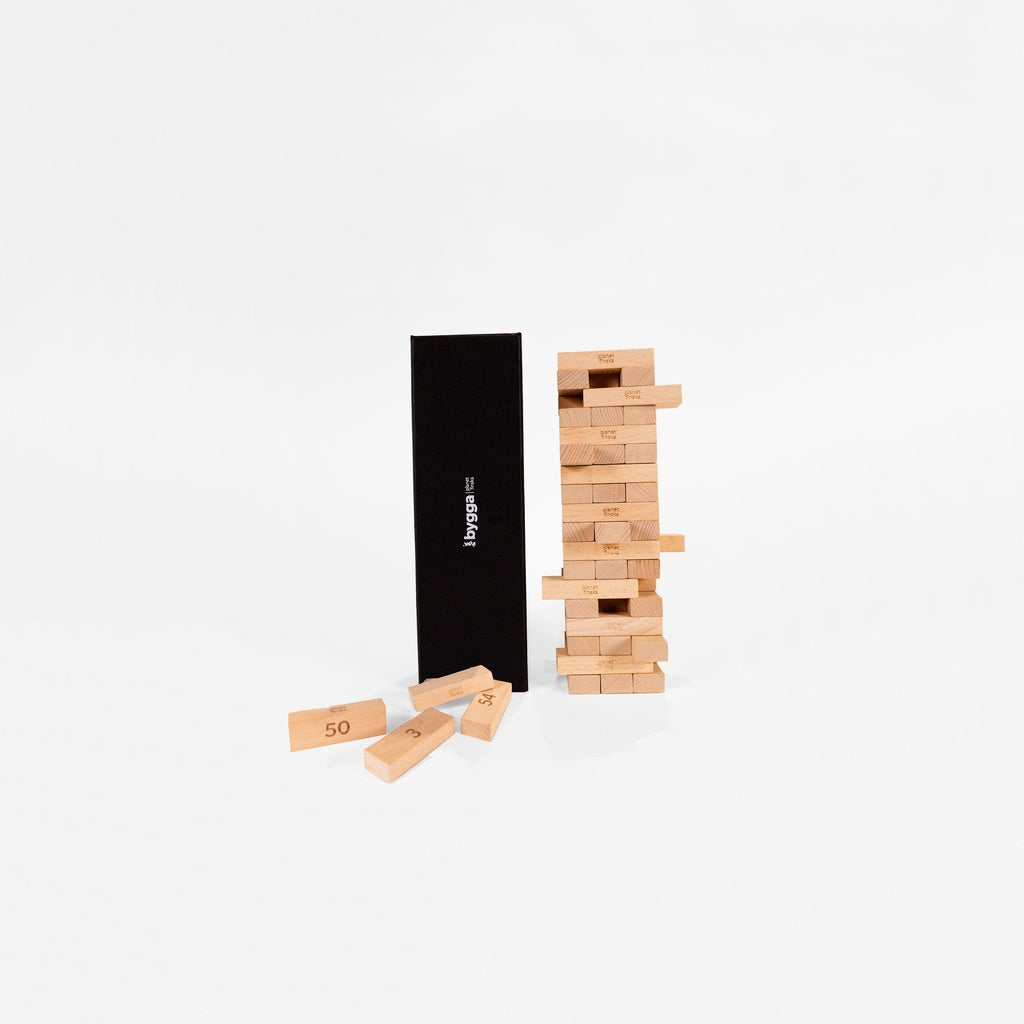 Vaga Element: Add a twist to the game with the included Vaga (Swedish for "dare") element. Each of the 54 beechwood blocks is numbered, and players can create 27 unique dares. Pull a block, complete the corresponding dare, or face a penalty! Prefer the classic version? You can play that way too.