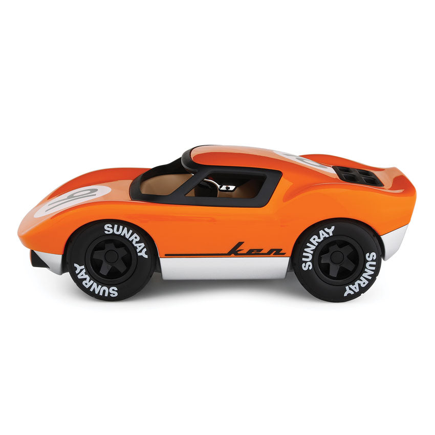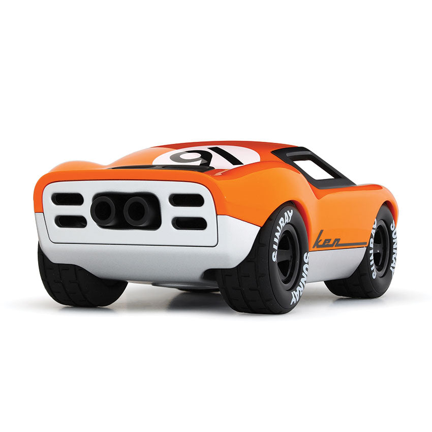 Ken Gibson is a meticulously engineered racing marvel, inspired by the iconic American cars of the late 60s and 70s. This dream machine showcases sleek curves in glossy retro orange, contrasted by black dual rear exhausts, 5-spoke wheels, and stylish trims. With a racing number roundel proudly displayed, Ken Gibson is ready to hit the track. The driver, equipped with a chrome helmet, is eager to race and already practicing that winning podium pose!