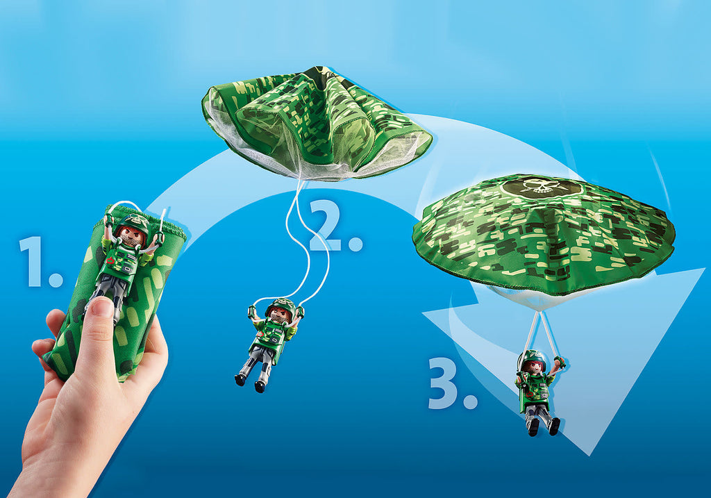 This police operation is a high-profile operation. The crook wants to escape with a parachute. But he did his calculations without the clever PLAYMOBIL police officer in his helicopter. While the thief slowly glides to the ground, the policeman, from the cockpit of the helicopter, always keeps an eye on him. When he lands, he is already expected. The next trip goes to prison. The playset contains two PLAYMOBIL figures policeman and criminal, a police helicopter, a parachute and many other extras for exciting air chases. Throw parachute and figure into the air and watch it float to the ground.