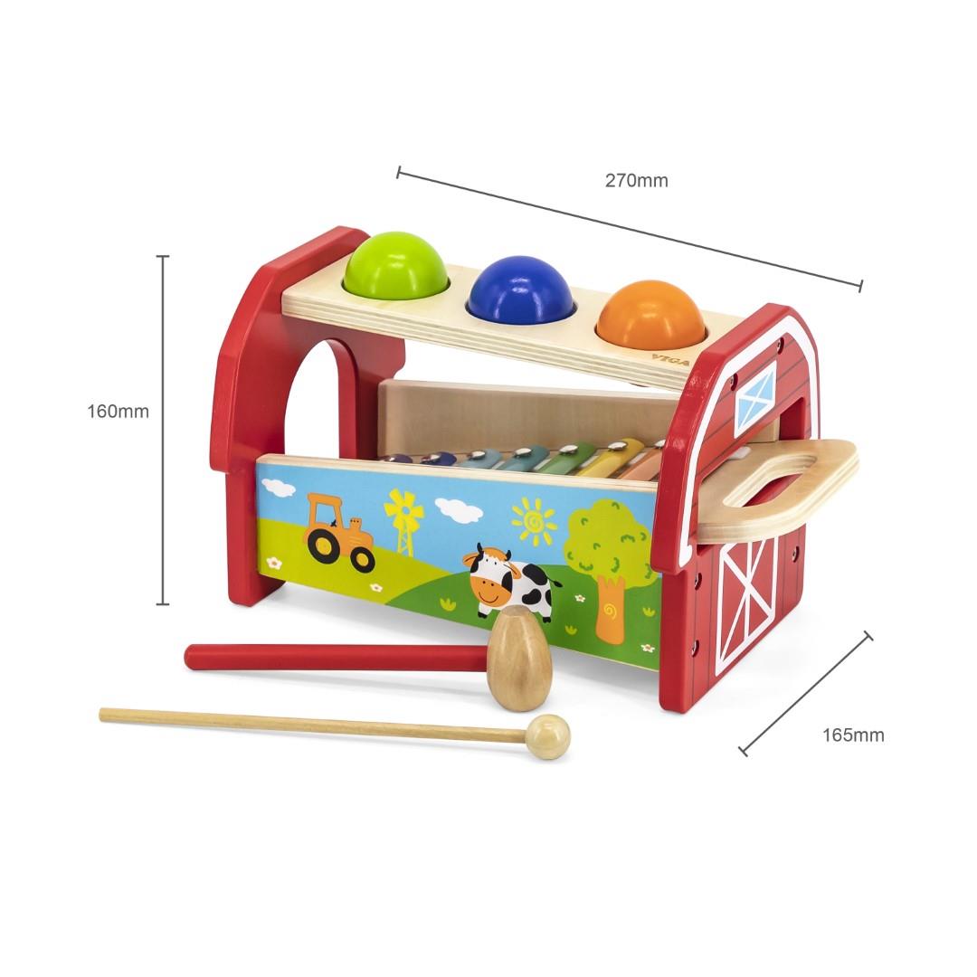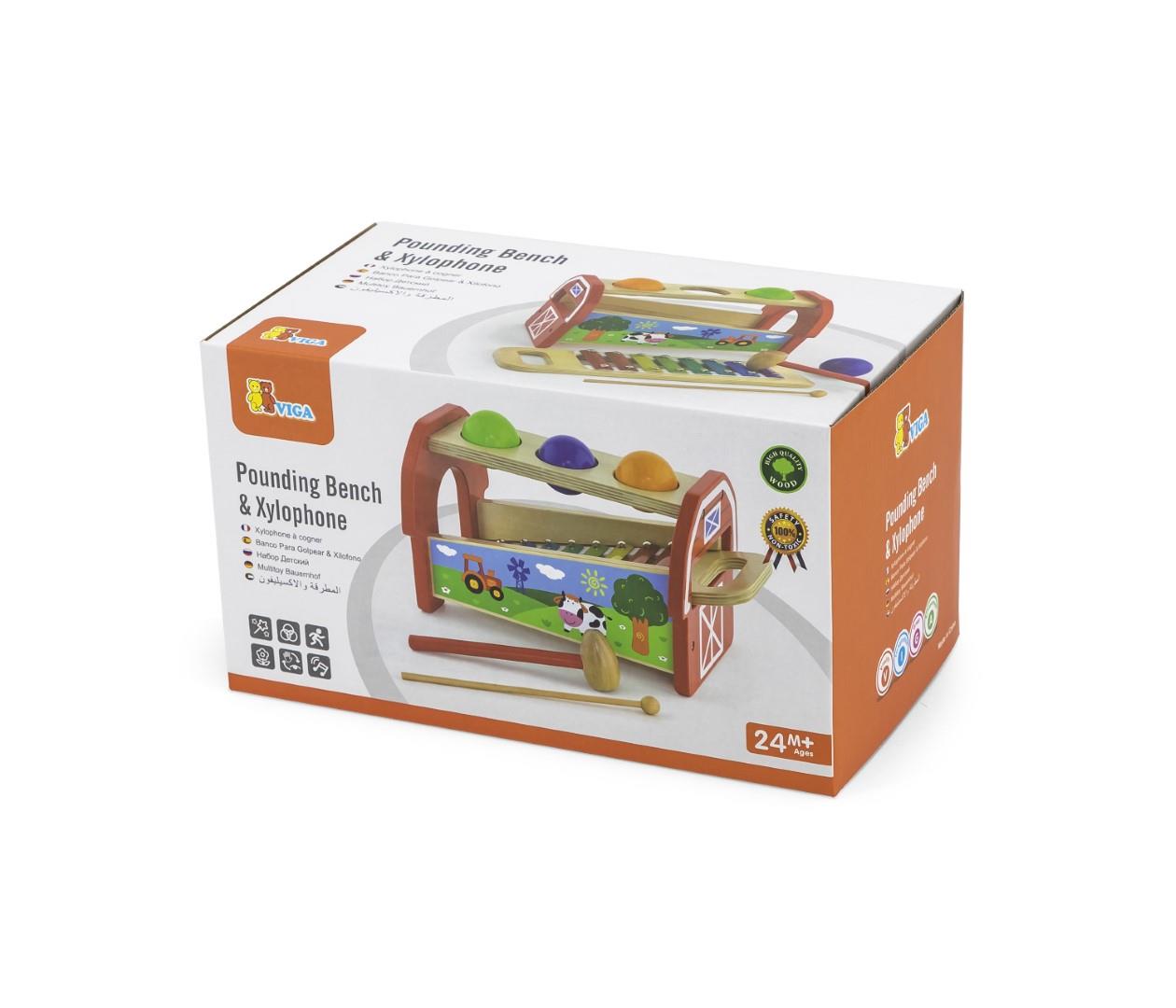 Explore the power of sounds with Viga's Pounding Bench & Xylophone. This vibrant set includes 3 rubberwood balls, a wooden mallet, and a hammer - great for toddlers aged 2 and up. Detach the xylophone and use it independently or with the bench for fun, creative percussion. The natural materials and FSC certification make this a safe, eco-friendly toy for hours of play.