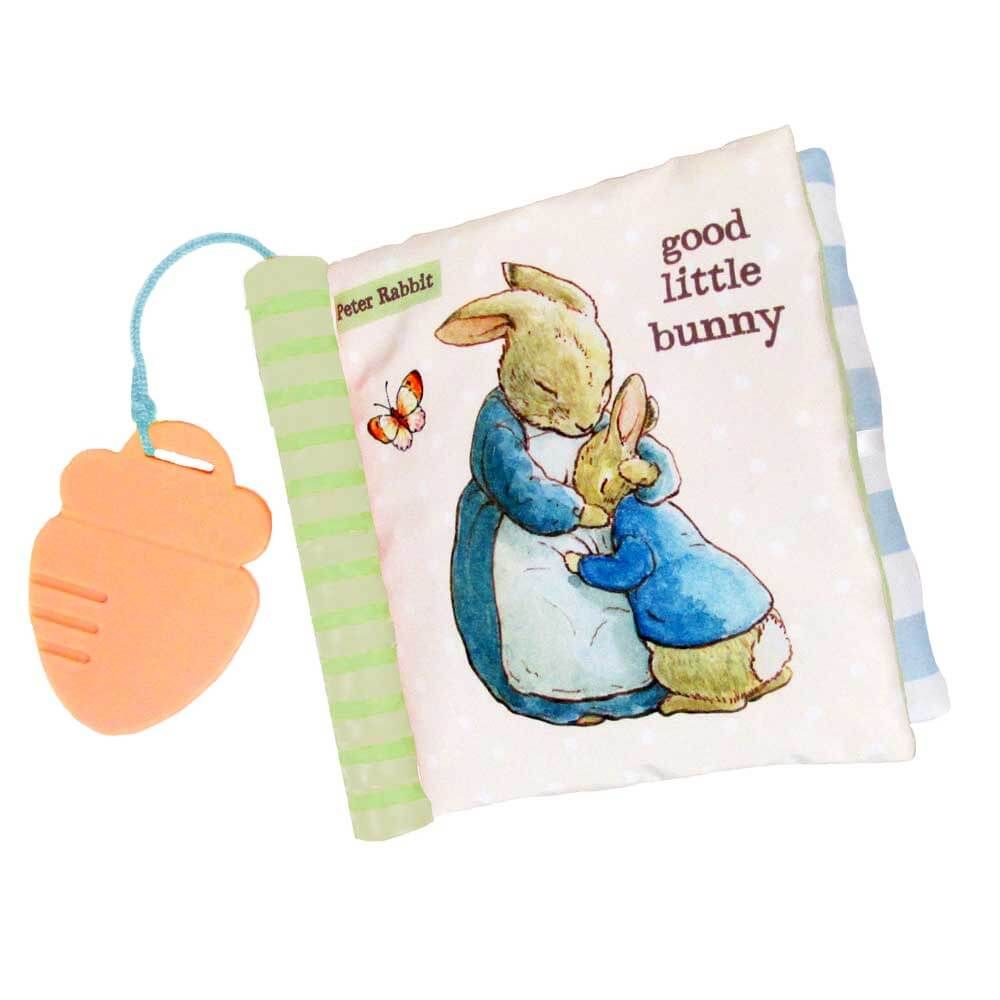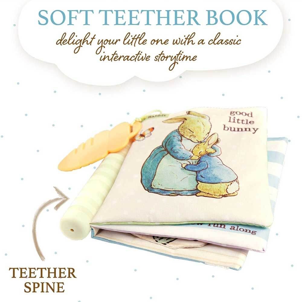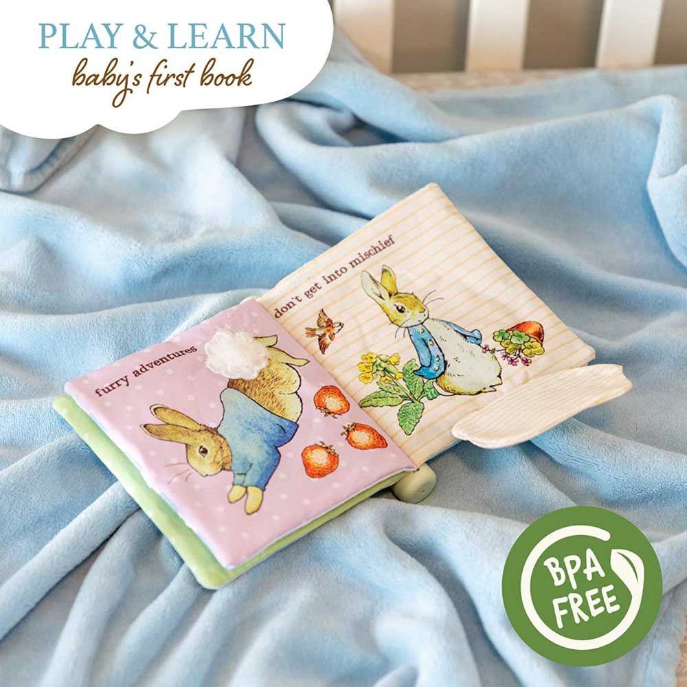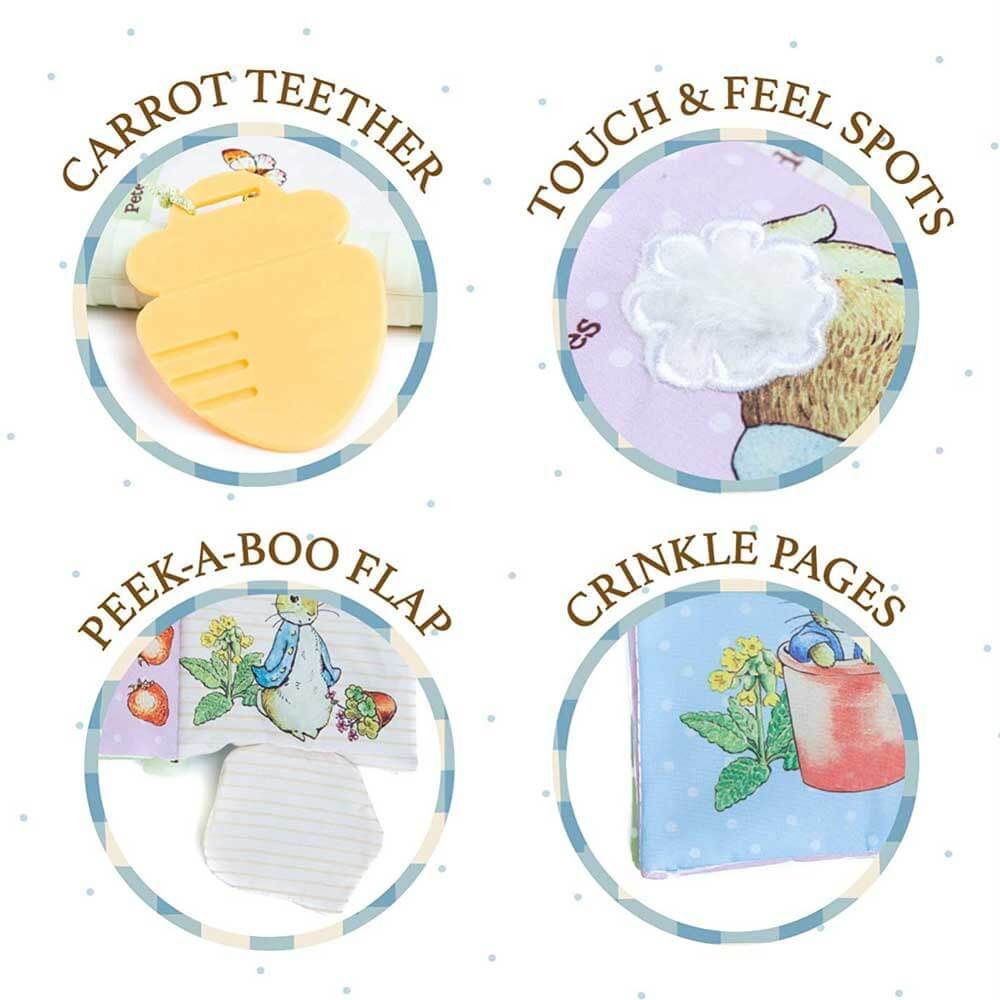 Inspired by Beatrix Potter's classic tale, this charming 17cm Peter Rabbit Soft Book is perfect for playtime or naptime. Featuring multi-sensory activities including squeaks, crinkles and textures, the book is also ideal for teething tots with its chew-friendly spine and carrot-shaped bookmark. Machine wash, gentle cycle, cold water.
