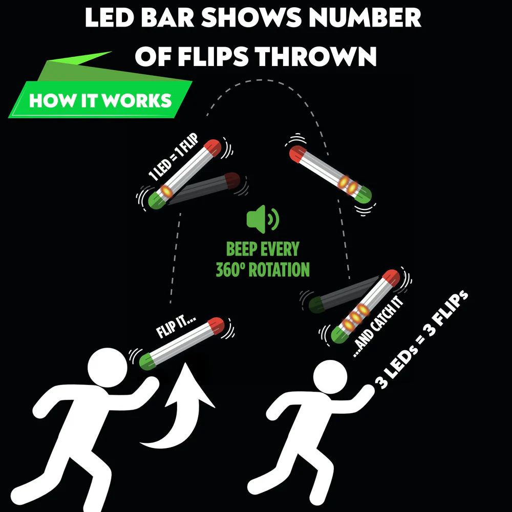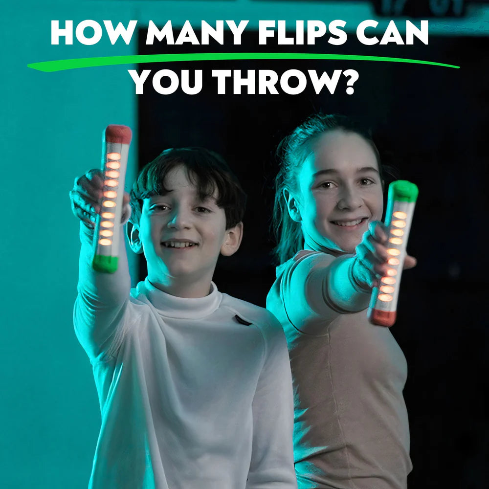 Stickflip counts your spins automatically! As Stickflip flips through the air, you’ll hear a beep with every full 360° spin. Catch it, and a colorful LED bar shows exactly how many flips you pulled off!