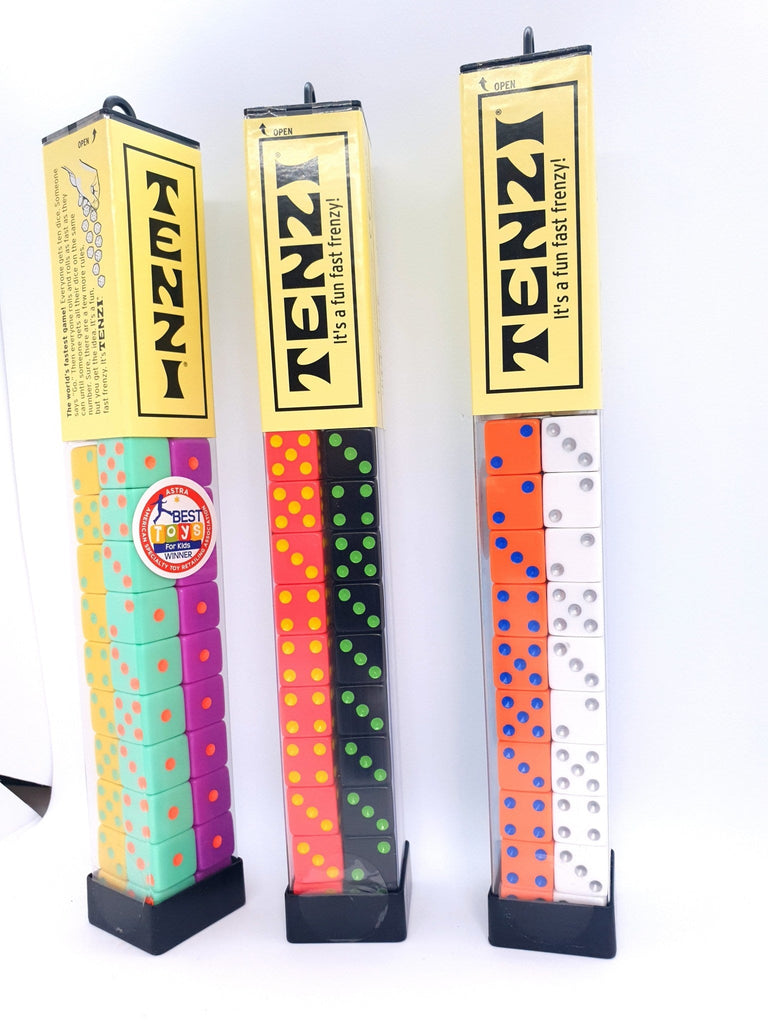 Tenzi is a fast & frenzied game, suitable for the whole family. Each player chooses a set of dice & rolls them, you then decide which number to go with, keep rolling the remaining die until all the dice shown has the same number. The first to succeed yells "TENZI" and is the winner of that round