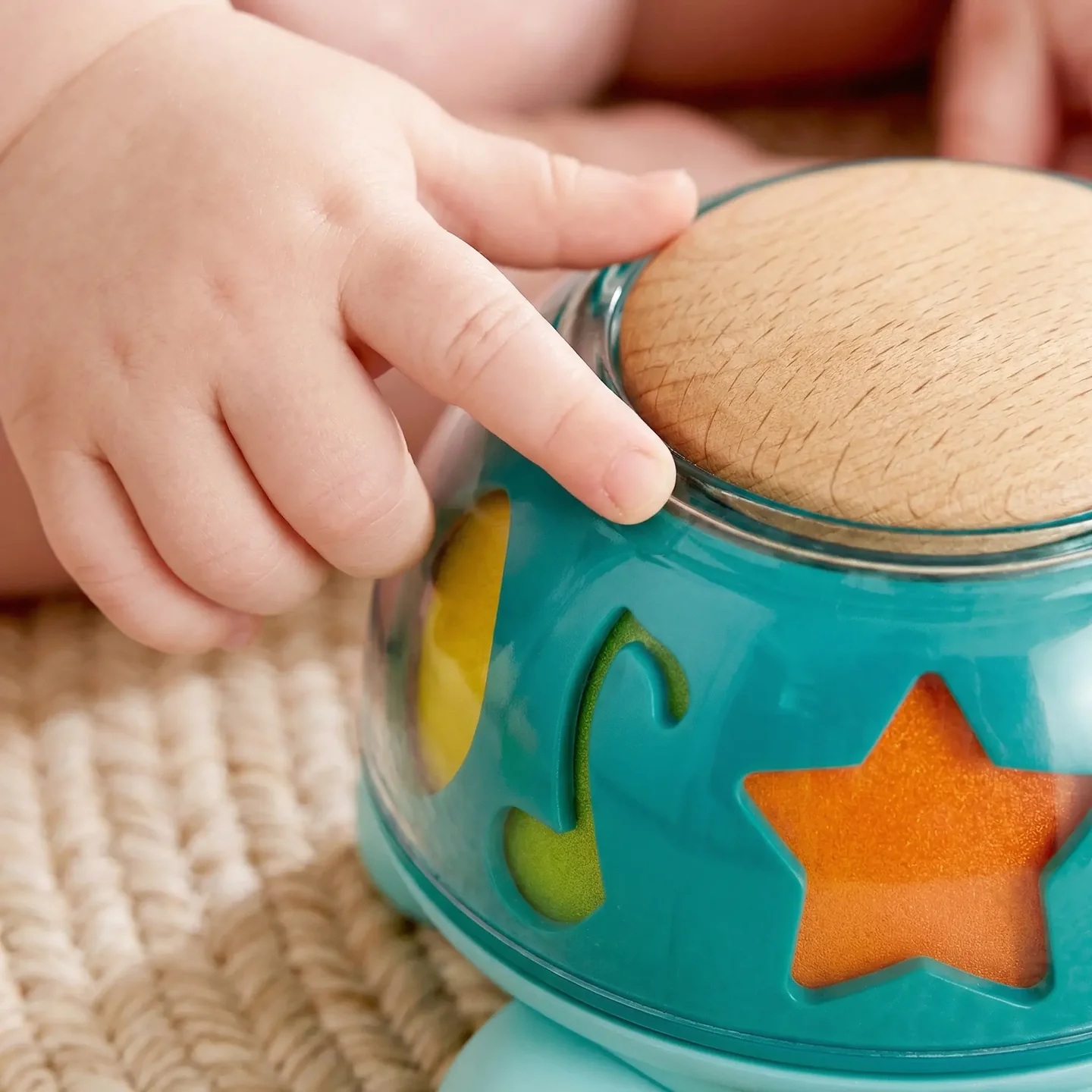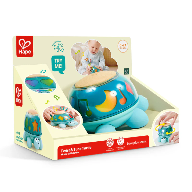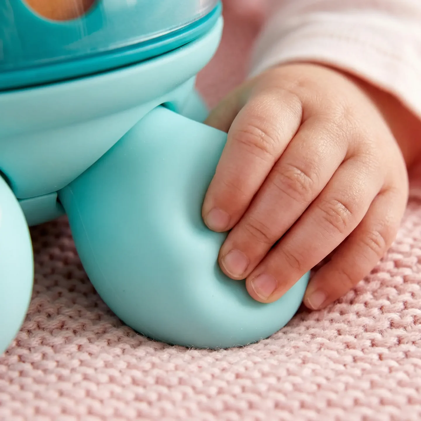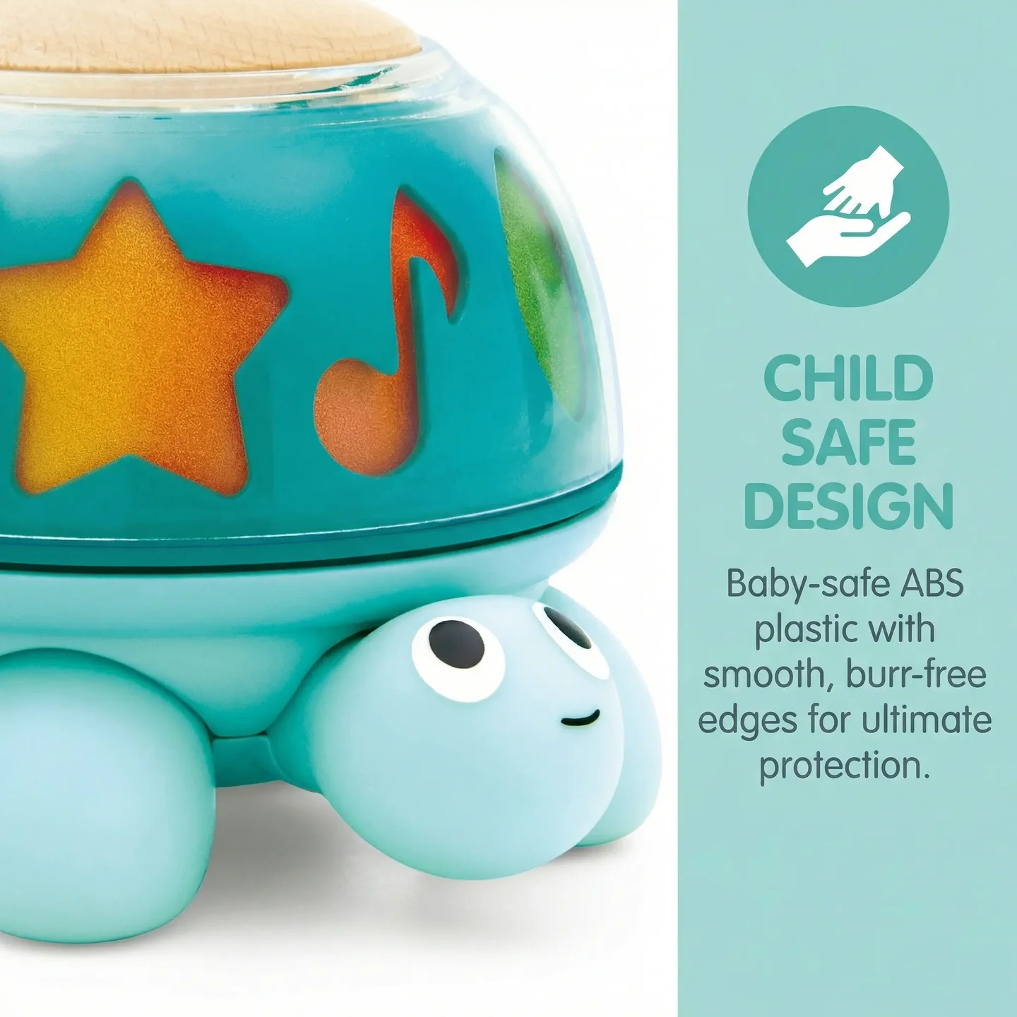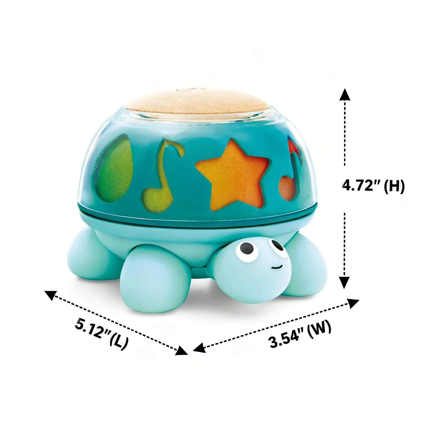 Encourage your baby to explore the turtle’s soft, textured limbs for tactile stimulation, and show them how to twist the shell to activate the music. Place the turtle in different positions to introduce variety and keep playtime engaging. The soothing music can also be used to help calm and get babies and toddlers ready for bedtime.