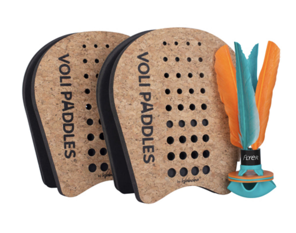 Rethink your paddle games with the Voli Racket Set. Meet the ultimate smackdown! Voli is an action-packed paddle game for camping, the park, backyard, and beach. Each paddle fits like a glove, but hits like a racket! Set includes 2 cork paddles and 1 Flyer. The racket is made from a cork surface, one size fits most and is ambidextrous. Suitable for ages 8+.